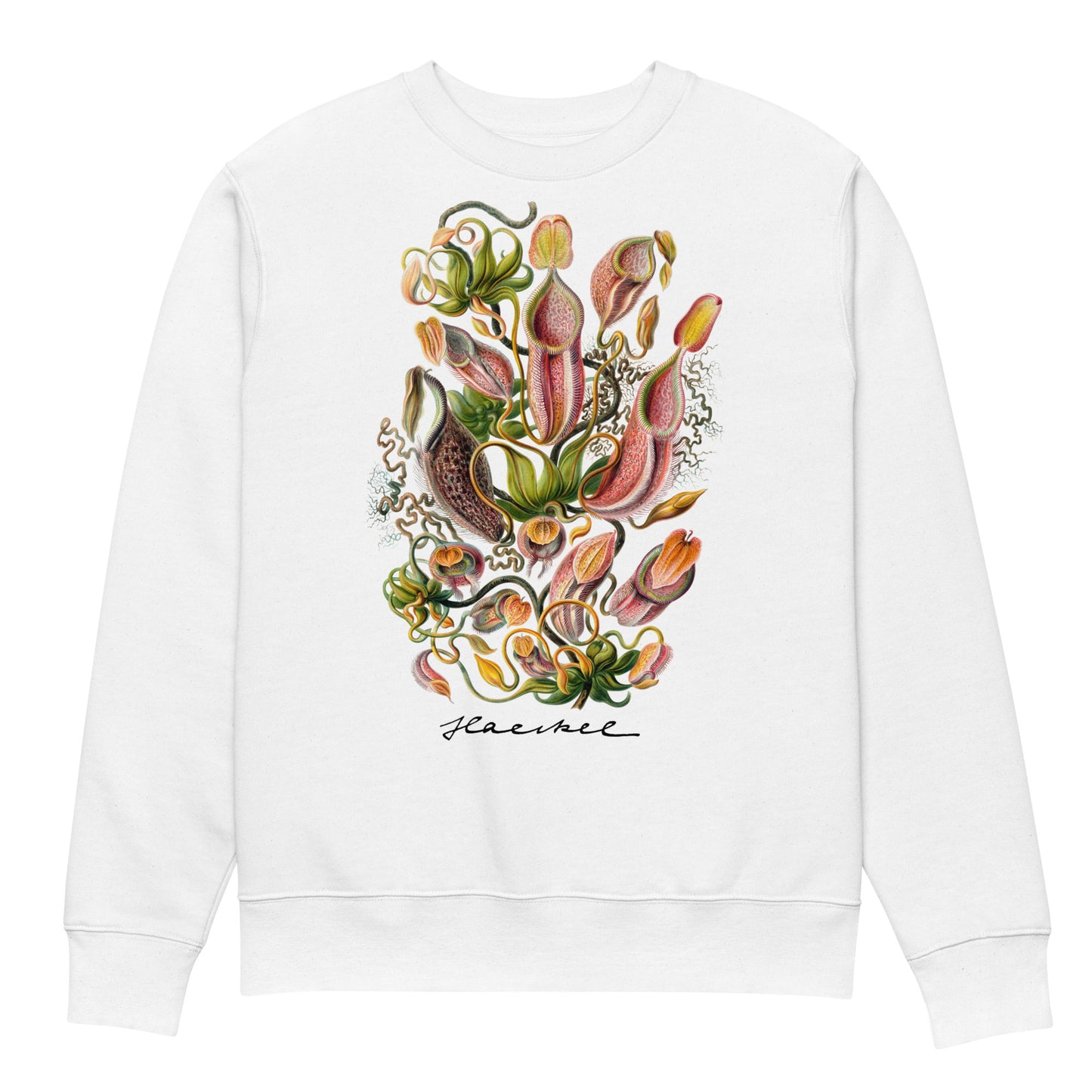 Stay cozy and stylish with this beautifully crafted organic cotton sweater, featuring a stunning illustration of the Nepenthes, or pitcher plant, by the celebrated 19th-century biologist and artist, Ernst Haeckel. Known for his meticulous and scientifically accurate depictions, Haeckel’s artwork brings the intricate beauty of the Nepenthes to life, showcasing the plant’s gracefully curved pitchers and delicate tendrils in exquisite detail. This design adds a touch of nature-inspired elegance to your wardrobe, making it perfect for those who appreciate both art and the natural world.