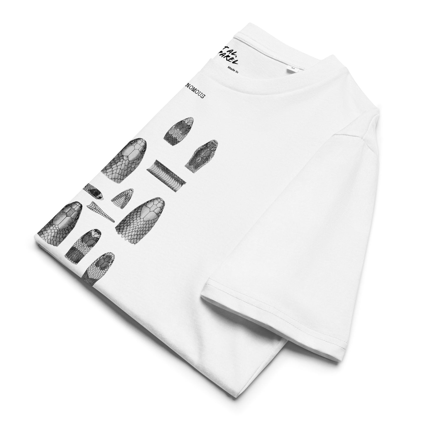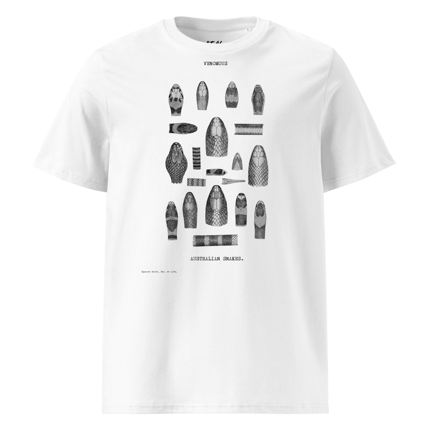 Explore the captivating world of venomous snakes with our Helena Scott Venomous Snakes of Australia Organic Cotton T-Shirt. This striking tee features Helena Scott’s meticulously detailed illustration of various venomous snakes native to Australia. The design showcases the distinctive characteristics of these formidable creatures, including their unique scale patterns, striking coloration, and the features that set them apart as venomous species.