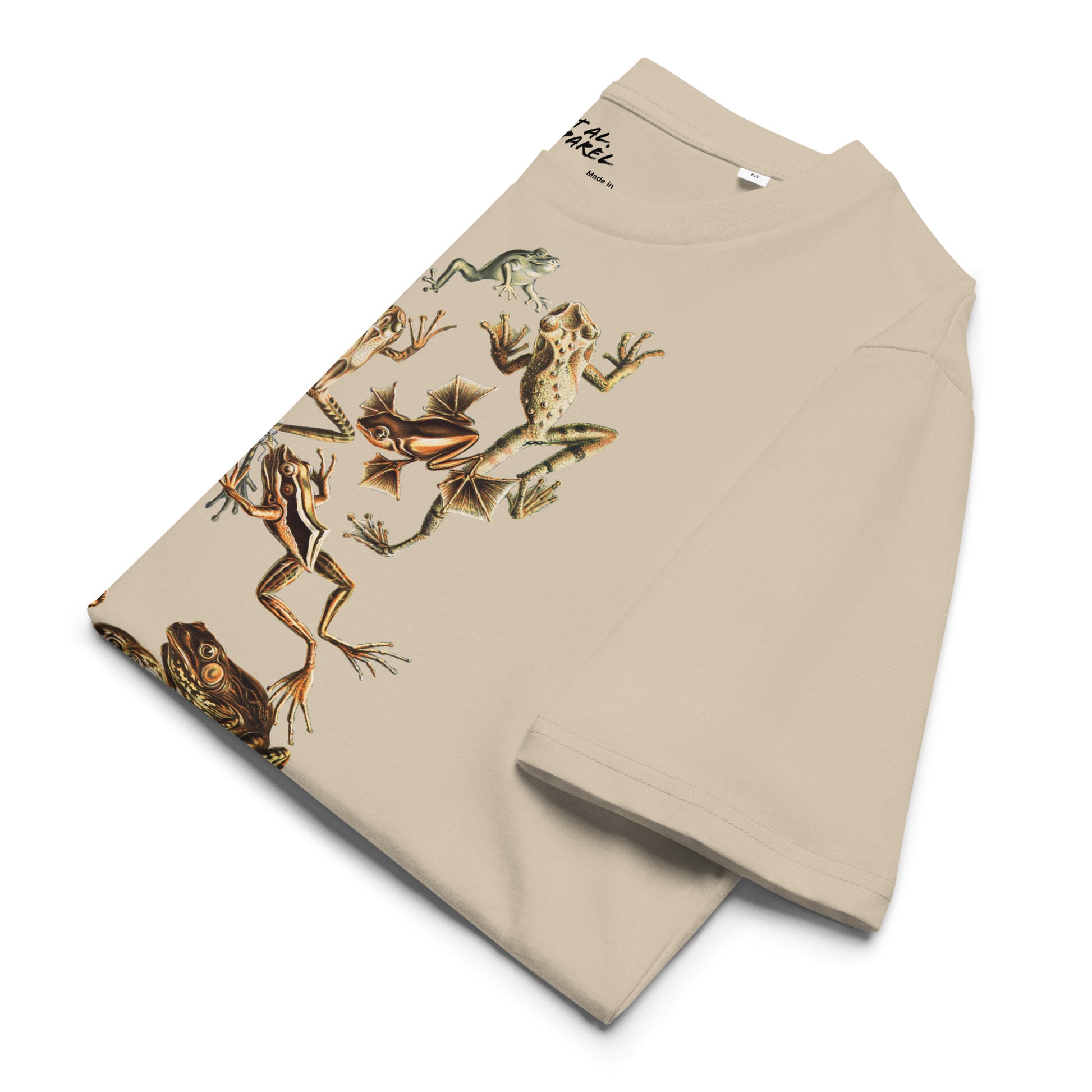 Printed using eco-friendly, non-toxic inks, the Batrachia design retains every intricate detail, from the subtle gradients in shading to the fine lines that define the contours of each amphibian. The result is a vibrant, detailed image that draws the eye and invites closer inspection, making this t-shirt a wearable work of art.