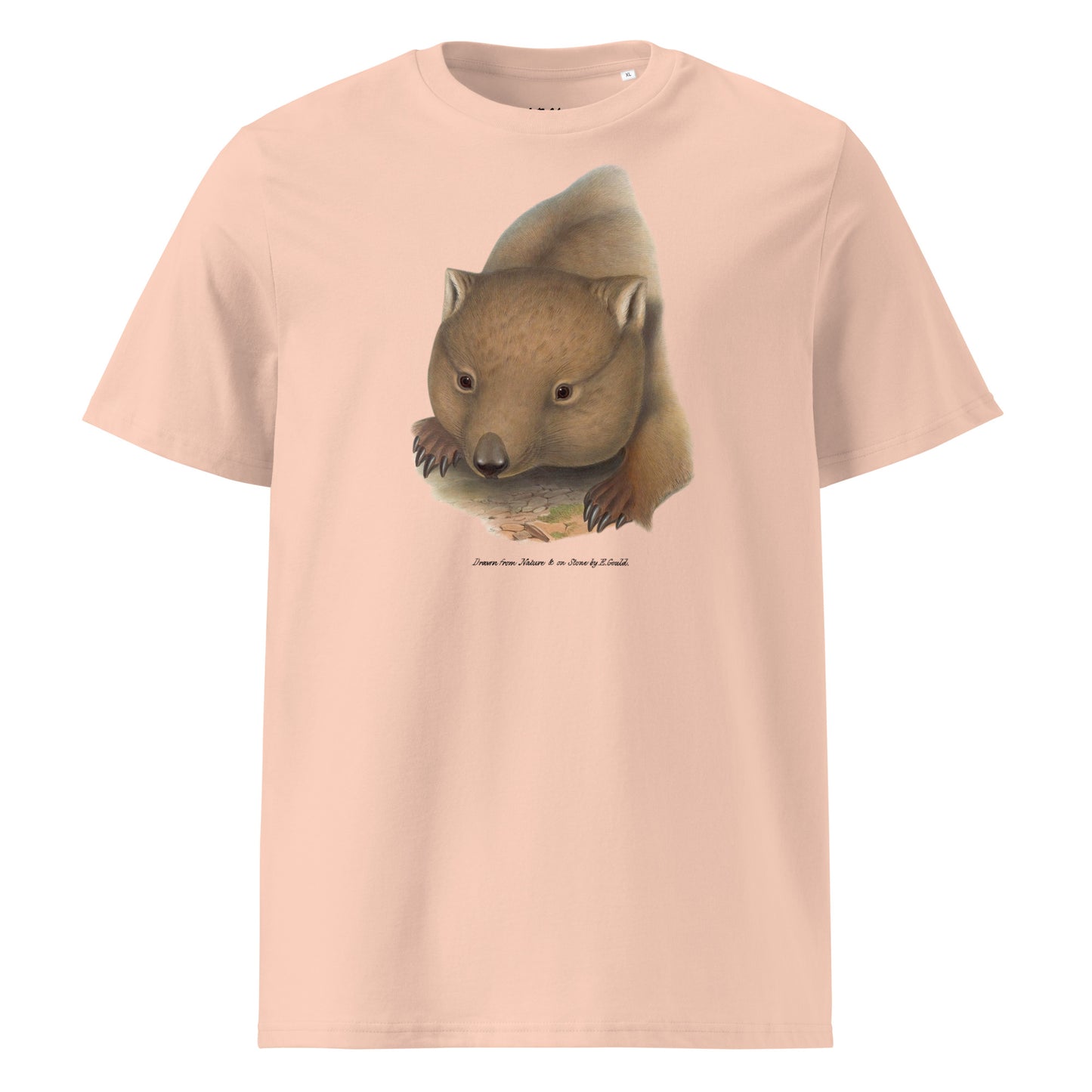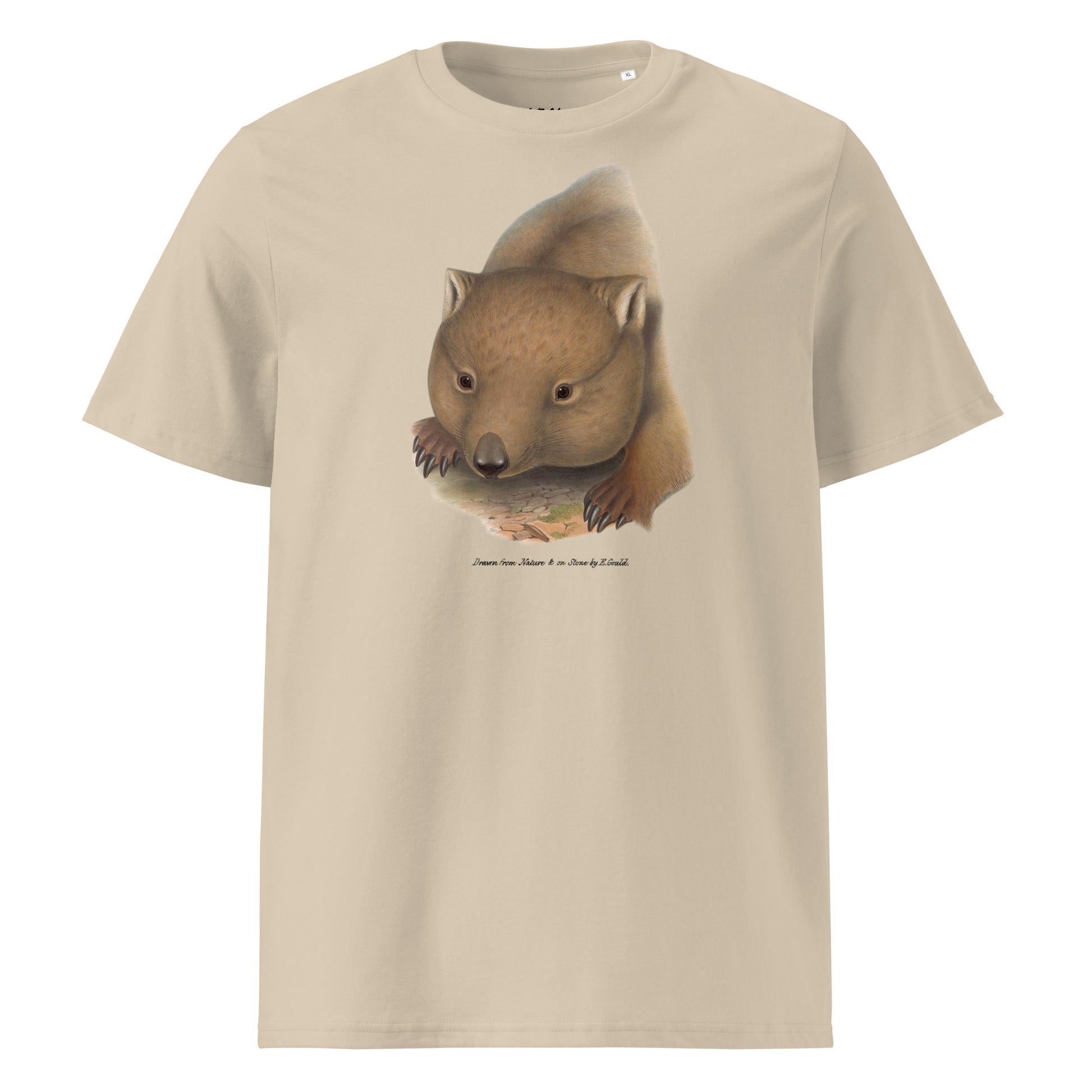 This organic cotton t-shirt features a close-up illustration of the Southern Hairy-nosed Wombat by Elizabeth Gould, showcasing her remarkable ability to capture the essence of her subjects with precision and warmth. In this design, Gould focuses on the wombat’s distinctive face, bringing attention to its broad, flattened nose, small rounded ears, and expressive eyes. The intricate detail in the fur highlights the coarse texture that characterizes this resilient marsupial, making the wombat’s face a striking focal point of the artwork. Gould’s depiction invites a closer look at the unique features that make the Southern Hairy-nosed Wombat such an iconic inhabitant of Australia’s arid landscapes.